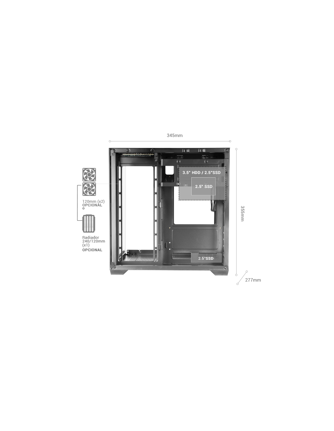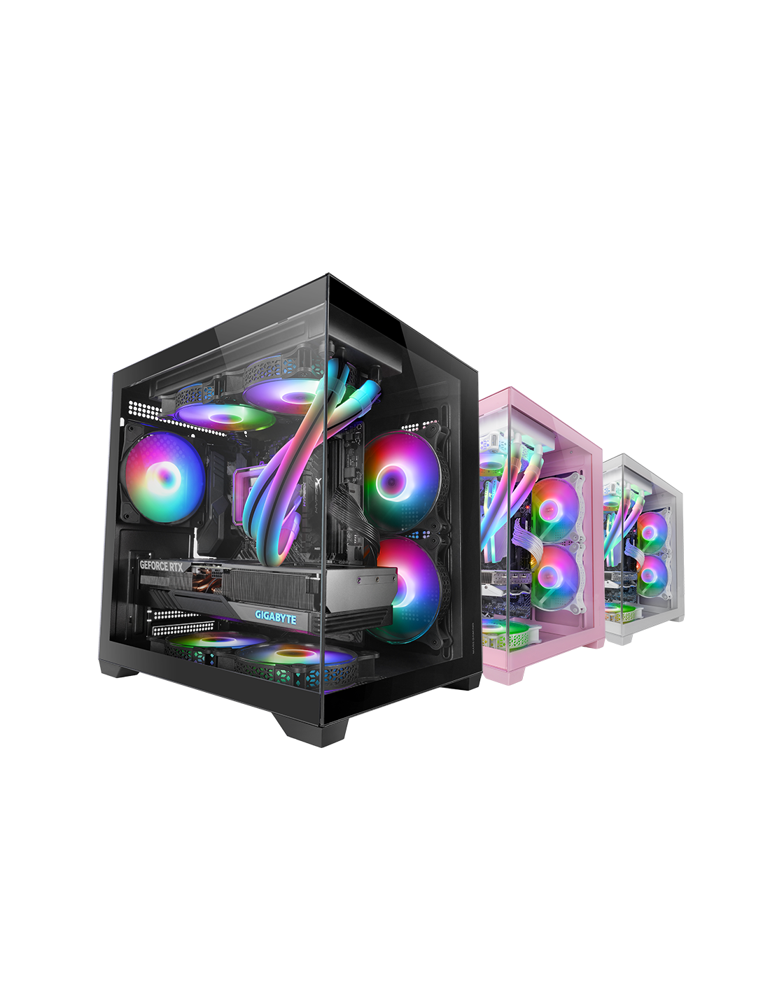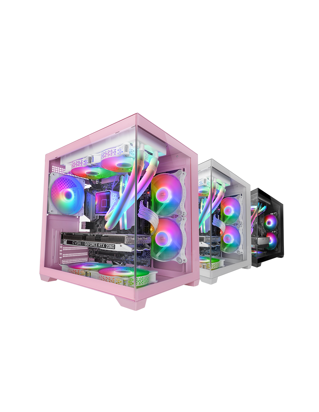 A minitorre MC-VIEW2 funde design de vanguarda e recursos avançados num formato compacto. O seu vidro temperado contínuo na frente e lateral proporciona uma visão panorâmica do interior, destacando cada componente com uma estética impecável. Equipada com uma ventoinha traseira FRGB de 120mm pré-instalada, proporciona uma refrigeração eficiente desde o primeiro momento. Além disso, o seu sistema de gestão de cablagem interna, compatibilidade com refrigeração líquida de até 240mm e suporte para até 7 ventoinhas de 120mm garantem um fluxo de ar otimizado, mantendo a tua configuração organizada e eficiente.
