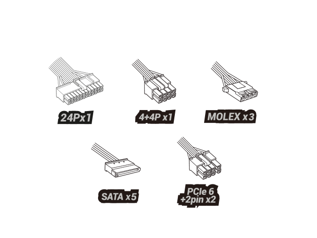 - · 1x ATX MB 24 PIN · 1x EPS +12V 4+4 PIN · 5x SATA · 3x Molex 4 PIN · 2x PCIe 6+2 PIN