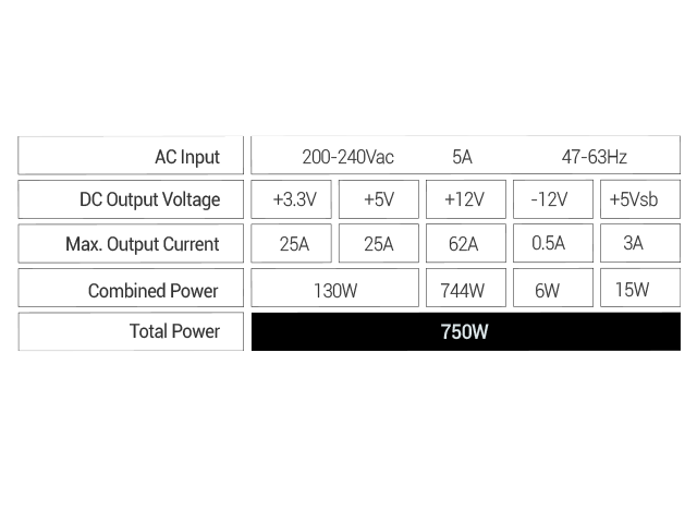 - +3.3V - 25A / +5V - 25A / +12V - 62A / -12V - 0.5A / +5VSB - 3A