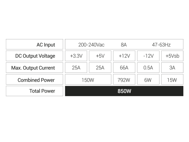 - +3,3V - 25A / +5V - 25A / +12V - 66A / -12V - 0,5A / +5VSB - 3A