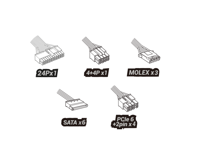 - · 1x ATX MB 24 PIN · 1x EPS +12V 4+4 PIN · 6x SATA · 3x Molex 4 PIN · 4x PCIe 6+2 PIN