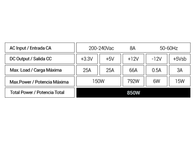 - +3,3V - 25A / +5V - 25A / +12V - 66A / -12V - 0,5A / +5VSB - 3A