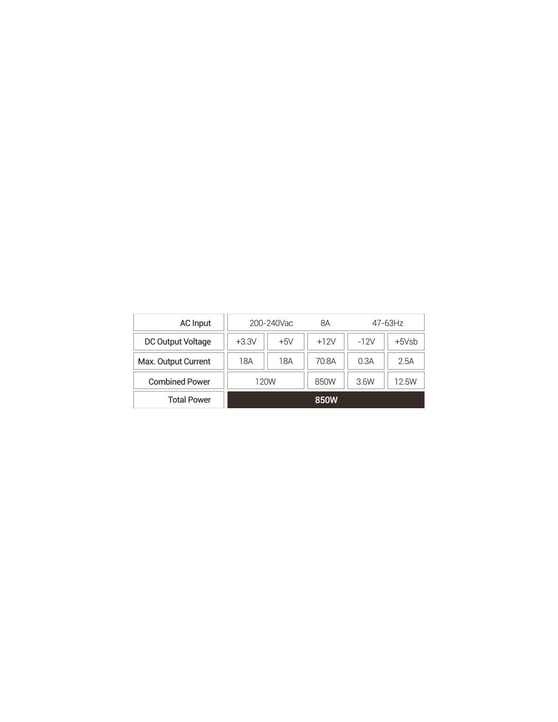 - +3.3V - 18A / +5V - 18A / +12V - 70.8A / -12V - 0.3A / +5VSB - 2.5A