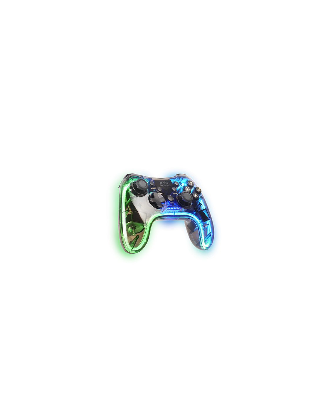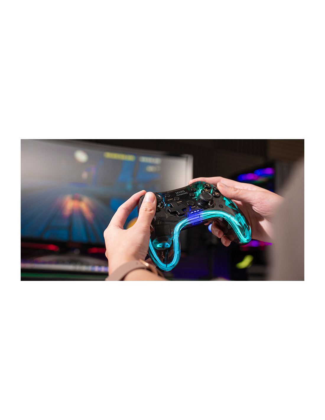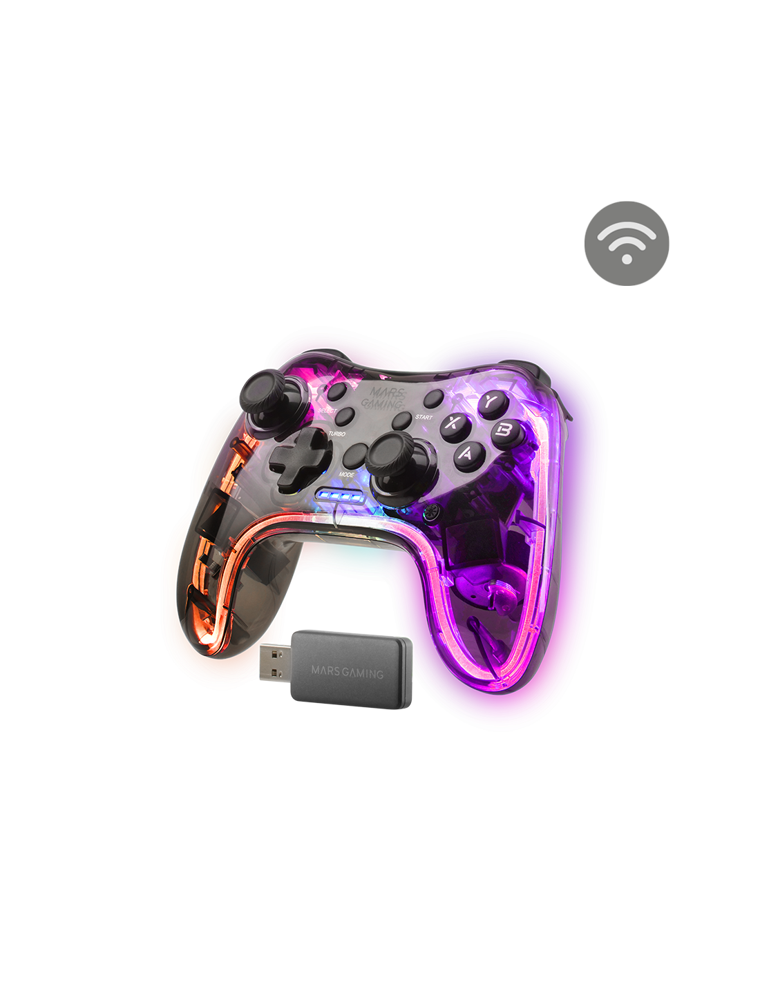 Gamepad com conexão sem fio profissional 2.4GPRO, sem lag e com máxima estabilidade de conexão. Design espetacular translúcido preto com iluminação NEON RGB. Sistema de vibração háptica dupla e compatibilidade superior multiplataforma.